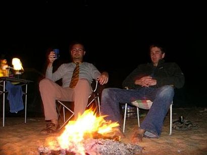 Tuvojoties vakaram, meklējam vietu, kur uzcelt teltis. Diemžēl sākas plašs smilšu klajums ar retu kamieļzāli un vēl retākiem kociņiem, kur, ja auto apstājas, tad uzsākt vairs nav iespējams. Buksē... Citu iebrauktās sliedes izklīst uz visām pusēm, der vairs tikai virziens uz pamalē redzamām klintīm. Pāris reizes mēģinām apstāties pie kāda koku pudura, bet konstatējam, ka smilts ir par mīkstu. Līdz ar pašu saules rietu beidzot atrodam cietāku vietu, bet pilnīgā klajumā, kur nav kur vējam aizķerties. Saule riet aiz tālumā redzamajām klintīm, ceļam teltis. Ar Dailiusu ejam kādu kilometru atpakaļ pie mazajiem kociņiem, un, saskrāpējuši rokas ar ērkšķiem, atgriežamies jau pilnīgā tumsā ar malkas klēpjiem. Vakariņas, sarunas... Vācieši atceras, ka viens no argumentiem ņemt gidu bija – gids zinās, kur var atrast malku...