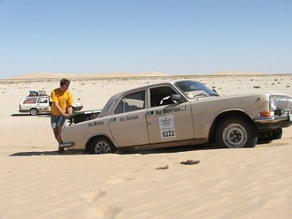 Pēc kartes paredzēts orientieris – upes gultne. Apraksts vēsta, ka bīstama vieta, mīkstas smiltis. Dabā tas izskatās kā smilšaina josla ar manāmi vairāk kociņu – laikam tiešām te ir nedaudz vairāk šķidruma, ja tie spēj augt. Traucamies smiltīm cauri lielā ātrumā, bet pasāts vienalga iestrēgst. Ierastā procedūra – laipas rokā, un brienu palīgā. Kamēr rokam un stumjam, mums garām pabrauc liela mūsējo grupa – pāris merserdesi, isuzu džips, džeta, divi landroveri, un seat simka, kā arī skorpio. Neviens neiestrēgst... Viens landrovers apstājas palīdzēt, bet knapi pats tiek prom. Tad piebrauc isuzu, un, smiltīm lidojot pa gaisu, izvelk pasātu. Esam priecīgi.