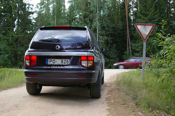 Tomēr, braucot pa Krasta ielu un pēc tam pa Salu tiltu kaut kas mulsina. Mašīnā jūtams neliels diskomforts. No sākuma pat nespēju definēt – kur ir problēma? Auto šķiet ērts, kluss, bet kaut kas nav... Jau braucot Baložu virzienā pēkšņi man „pielec” – piekare! Katra – pat vismazākā bedrīte vai nelīdzenums – ir sajūtami mašīnas salonā. Ir tāda sajūta, ka Kyron brauktu ar pilnībā nolietotiem amortizatoriem. Tomēr neļaujos pirmajiem iespaidiem, jo tikko esmu pārkāpis no samērā zemas un stabilas mašīnas. Ir vairāk kā divas dienas laika, lai saprastu, kas tad īsti notiek ar piekari.