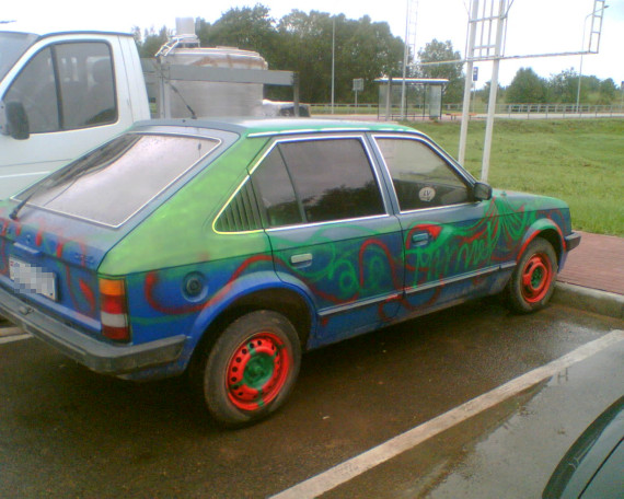 Lasītājs: Nesen gadījās redzēt "INTERESANTU" auto - "lauku auto grafitti". Izskatās, ļaudis trenējušies auto apgleznošanā vai kā tamlīdzīgi. Izskatās jau tā pabriesmīgi, bet tomēr amizanti.