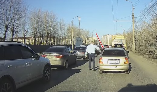 Autovadītājs paceļ priekšābraucošās mašīnas šofera izmesto izsmēķi un "atdod to īpašniekam". Lasīt vairāk