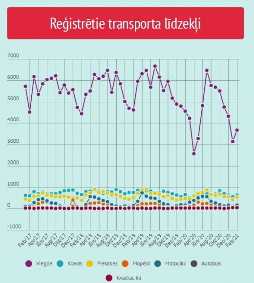 āpat 2021.gada pirmajos divos mēnešos pirmreizēji reģistrētas 1197 kravas automašīnas, kas ir par 0,9% mazāk nekā pagājušā gada pirmajos divos mēnešos, 54 autobusi, kas ir par 46,5% mazāk nekā pērn attiecīgajā periodā, kā arī 265 motocikli un tricikli, kas ir par 22,7% mazāk.