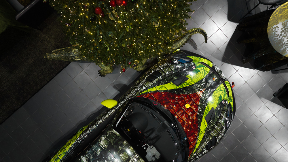 Tāpat auto vizuālajā noformējumā ir integrēta latviski zaļā krāsa, kas saistās ar Latvijas bagātību – mežiem, tikmēr sarkanais tonis simbolizē daļu Latvijas valsts karoga. Papildu akcentam un košumam ir izmantotas dinamiskas krāsu līnijas, tekstā norādot "Kaimanu mednieks. Latvijas leģenda".