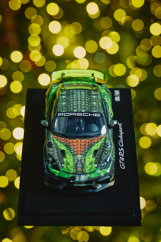 Ekskluzīvais "Porsche 718 Cayman GT4 RS Clubsport "Cayman Hunter" – Limited Edition" 1:18 mēroga modelis izceļas ar izsmalcinātu detaļu precizitāti un autentisku dizainu, kas lieliski atspoguļo īstā automobiļa raksturu.