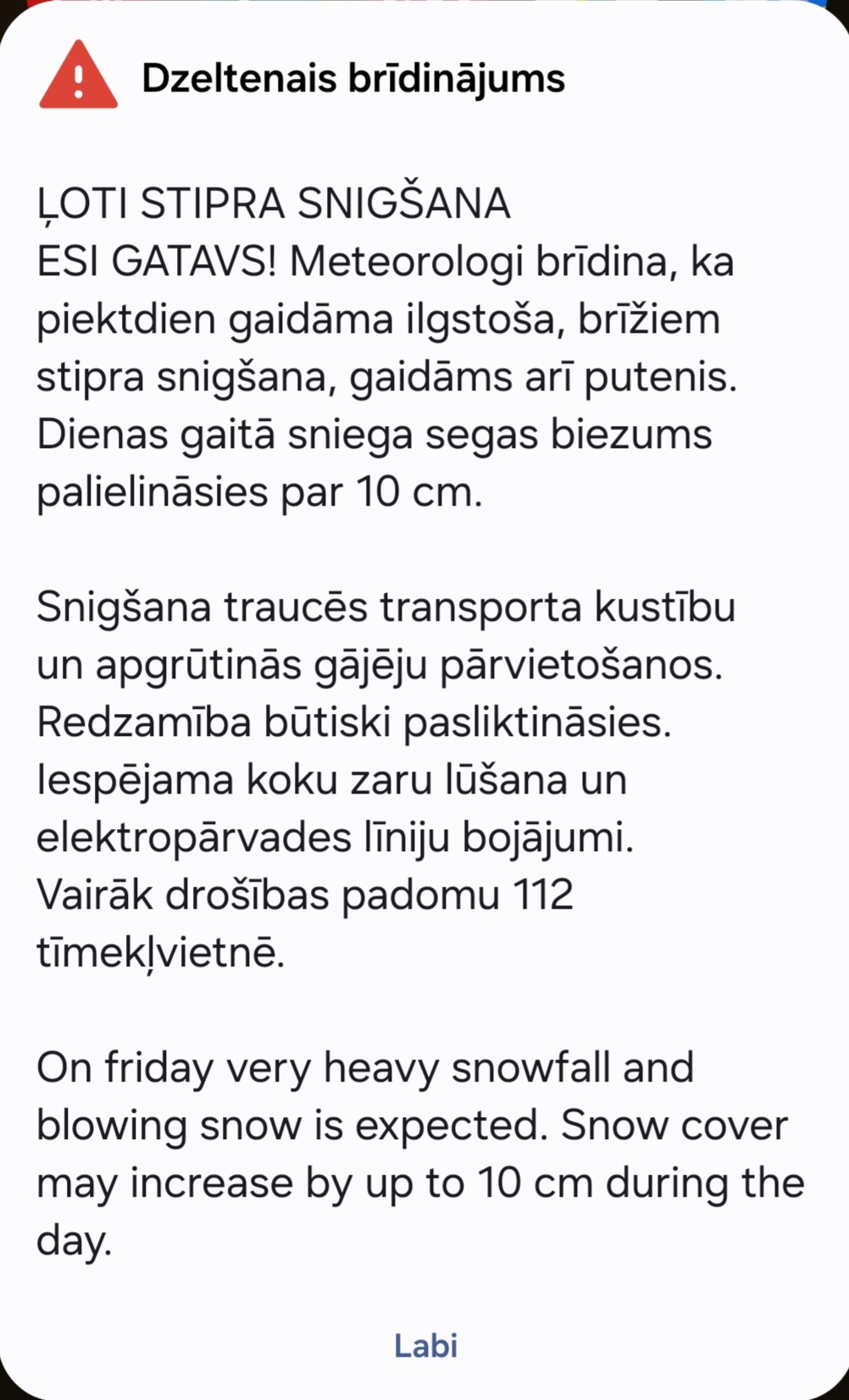 LVC atgādina, ka autoceļus tīra un kaisa arī snigšanas laikā, taču ārkārtīgi spēcīgas snigšanas un puteņa laikā sniega kārta un aizputinājumi veidojas atkārtoti un ātrāk, nekā tos ir iespējams novērst. Uzturēšanas darbiem šādos laika apstākļos ir mazs efekts.