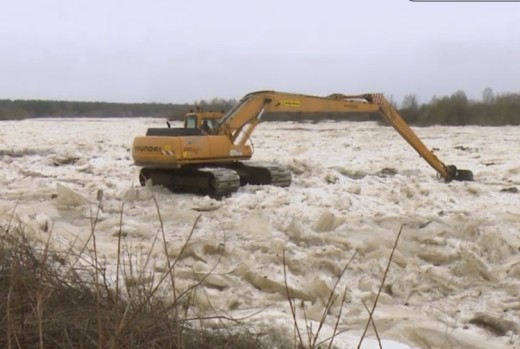 Smagā tehnika Sakas upē uzbrauc uz ledus, lai palīdzētu attīrīt ceļu ūdens straumei. Lasīt vairāk
