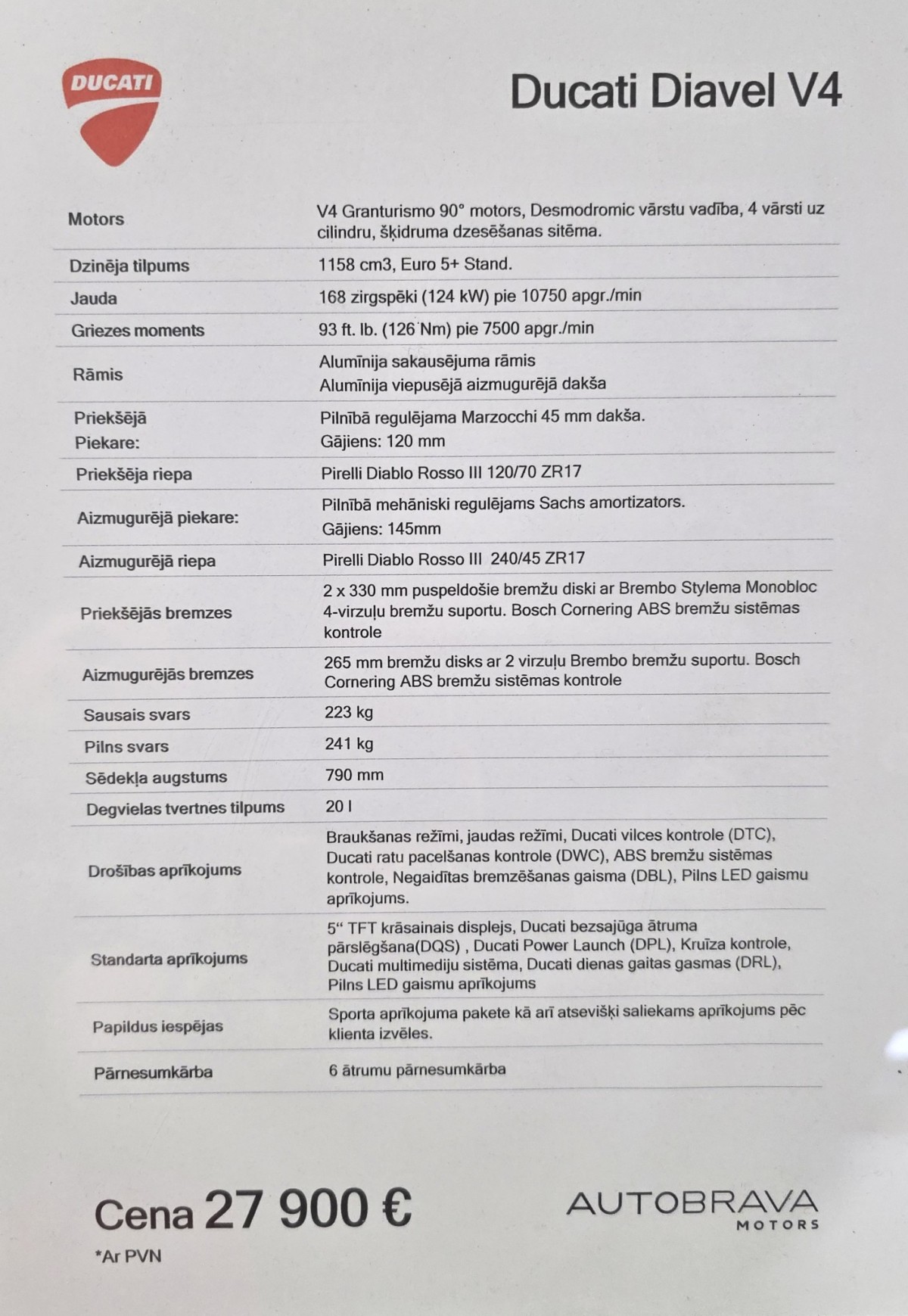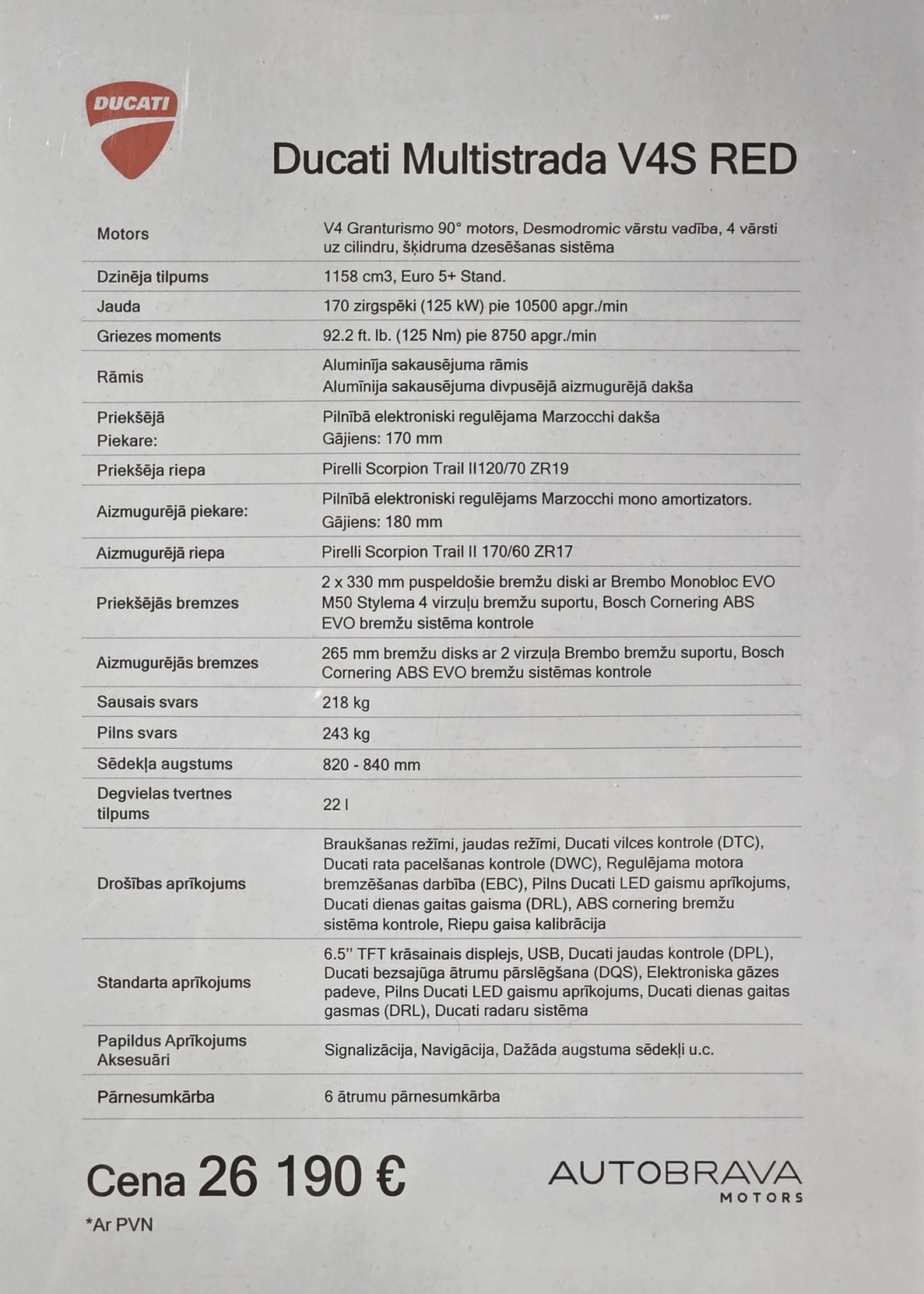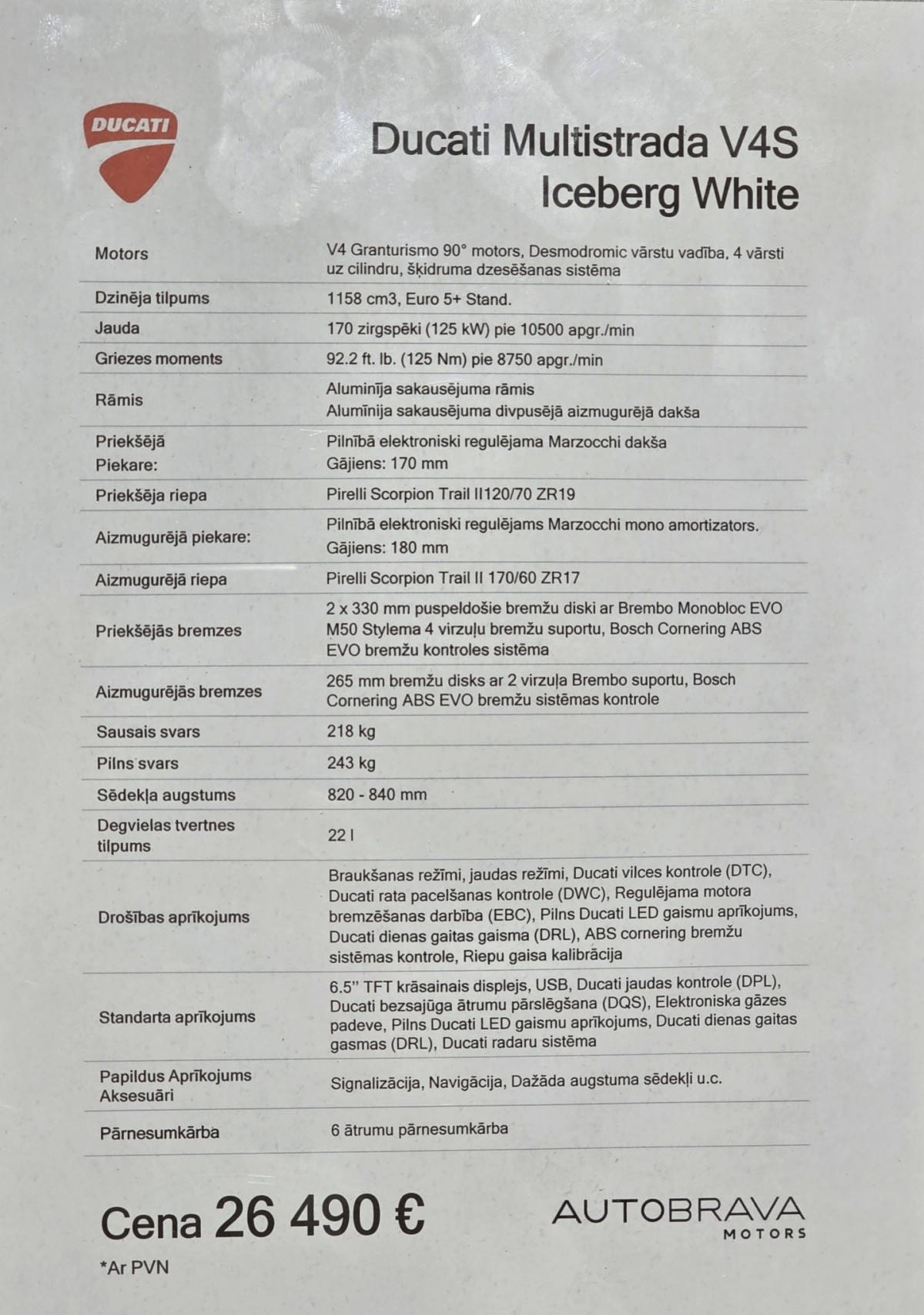 Jaunais “Ducati” modelis “Multistrada V2”, kas pirmo reizi Latvijā prezentēts 9. aprīlī, apvieno izcilu komfortu, vieglu vadāmību un “Ducati” raksturīgo dinamisko veiktspēju. Tas ir aprīkots ar “V2” divcilindru dzinēju, kas nodrošina 85 kW jaudu un maksimālo griezes momentu 92,1 Nm, garantējot spēcīgu un vienmērīgu paātrinājumu jebkuros apstākļos. Salīdzinot ar iepriekšējo modeli, jaunais “V2” dzinējs sver tikai 54 kg un ir par aptuveni 5,8 kg vieglāks, padarot šo par visvieglāko divcilindru dzinēju, kas ražots Borgo Panigales apgabalā.