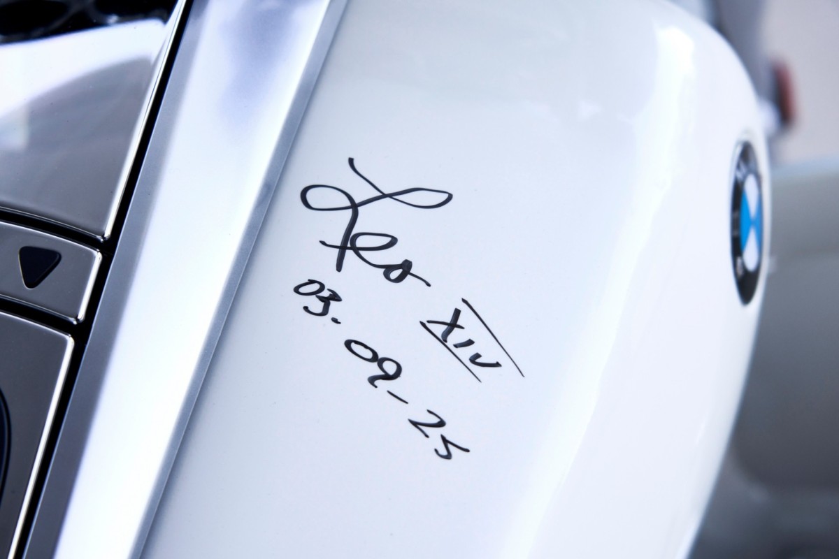 Lielais brīdis pienāca pašā Vatikānā: BMW Motorrad izpilddirektors Markuss Flašs un Vācijas nodaļas direktors Mihaels Zommers pēc vispārējās audiences personīgi nodeva motociklu pāvestam Leo XIV, kas deva savu svētību un atstāja parakstu uz degvielas tvertnes.