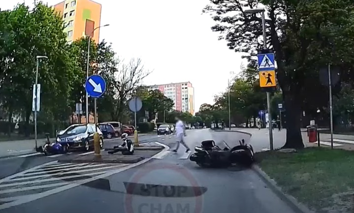 Viens no motociklistiem pamana gājēju pie pārejas un sāk bremzēt, taču aizmugurē braucošais tam nav gatavs. Lasīt vairāk