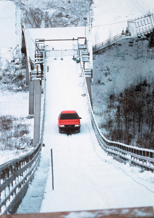 1986. gadā Audi pārsteidza pasauli ar drosmīgu reklāmas klipu, kurā vācu rallija pilots Haralds Demuts (Harald Demuth) ar Audi 100 quattro veica pārdrošu braucienu augšup pa sniegotu tramplīnu Kaipolā, Somijā. Tramplīns sasniedz 37,5 grādu stāvu leņķi un līdz pat filmēšanas brīdim nevienam nebija pilnīgas pārliecības par veiksmīgu iznākumu. Taču quattro sistēma attaisnoja uz to liktās cerības un reklāmas klips kļuva par vienu no atpazīstamākajiem auto pasaulē.