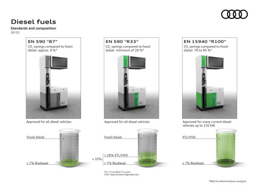 Visus V6 dīzeļdzinējus ar jaudu līdz 210 kW (286 ZS) ieskaitot sērijās A4, A5, A6, A7, A8, Q7 un Q8, kas ražoti no 2022. gada februāra vidus, iespējams uzpildīt ar HVO degvielu. HVO uzpildīšanas iespēja Q5 būs pieejama no marta sākuma, bet vasarā šim klāstam pievienosies arī A6 allroad ar dzinēju jaudu līdz 180 kW (245 ZS).