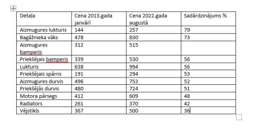 Divi piemēri, kas raksturo automašīnu detaļu cenu eskalāciju: Kopš 2013. gada bagāžnieka vāki kļuvuši par gandrīz 73 procentiem dārgāki, aizmugurējie lukturi pat par 79 procentiem dārgāki.