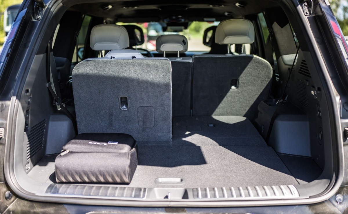 Nepatika: Ar paceltiem 3.rindas sēdekļiem bagāžai paliek tikai 308 litri – pamaz, ja salīdzinām ar konkurentiem. Pie 90 km/h uz nelīdzena ceļa ir jūtama liela neatsperotā piekares statnes elementu un riteņu masa (riteņu izmērs 285/45 R21), amortizatoru veiktspēja radīja subjektīvu diskomfortu. Normālā braukšanas režīmā pie āra gaisa temperatūras +4 grādi, patēriņš testa braucienā bija paliels 30,9 kWh / 100 km. Atsevišķiem viduskonsoles un durvju elementiem cenai neatbilstoša pacieta plastmasa apdarē. Masīvas A statnes un tām tuvu izvietotie spoguļi veido pagrūti pārredzamu zonu (tas daļēji tiek kompensēts ar apkārtskata kamerām).