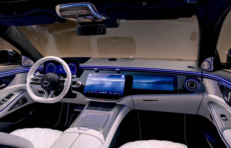 Salona centrālais elements ir MBUX Superscreen – liela stikla virsma ar vadītāja un pasažiera displejiem, kas apvieno informāciju, izklaidi un personalizāciju. Sistēmu papildina jaunākās paaudzes MBUX ar mākslīgā intelekta integrāciju, tostarp ChatGPT, Bing un Google risinājumiem.