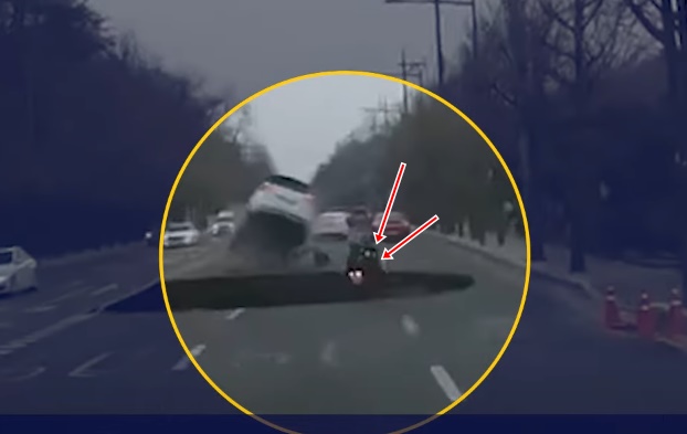 Automašīnā braucošajiem paveicas - viņu auto kustības inerce izmet atpakaļ uz stingras virsmas, taču motociklists iegāžas 20 metru dziļā izskalojumā, un, kā vēsta video, 17 stundas vēlāk viņa nedzīvo ķermeni atrod 50 metrus tālāk metro tunelī. Lasīt vairāk