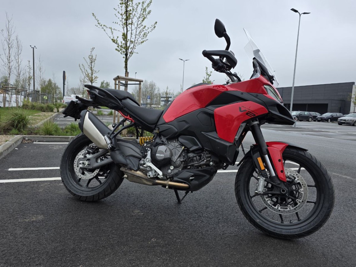Jaunais dzinējs nodrošina vilkmi tieši tur, kur tā visvairāk nepieciešama – ar spēcīgu vidējo diapazonu un vēlmi turpināt griezties līdz pat 10 000 apgr./min. Lai gan motocikls labi jūtas pie īsākām pārnesumu maiņām, tas ļauj izbaudīt arī dinamisku braukšanu līkumainos ceļos un izmantojot garus pārnesumus. Elektronika ir pārdomāti integrēta un funkcionāla – braukšanas režīmi un piekares iestatījumi ļauj precīzi pielāgot motocikla uzvedību pēc vajadzības. Ātrumpārslēgs darbojas tik gludi, ka sajūga sviru nākas izmantot tikai startējot vai apstājoties, bet bremžu sistēma lieliski sader ar šasiju, sniedzot pārliecību pat negaidītās situācijās. Piedzīvojumu meklētājiem “Multistrada V2” joprojām piedāvā “Enduro” režīmu un bezceļa ABS – vien jāpatur prātā, ka lietie alumīnija diski nav paredzēti akmeņainiem ceļiem. Bet platās stūres dēļ ir jāuzmanās, manevrējot šaurās vietās pilsētās vai braucot starp automobiļiem.