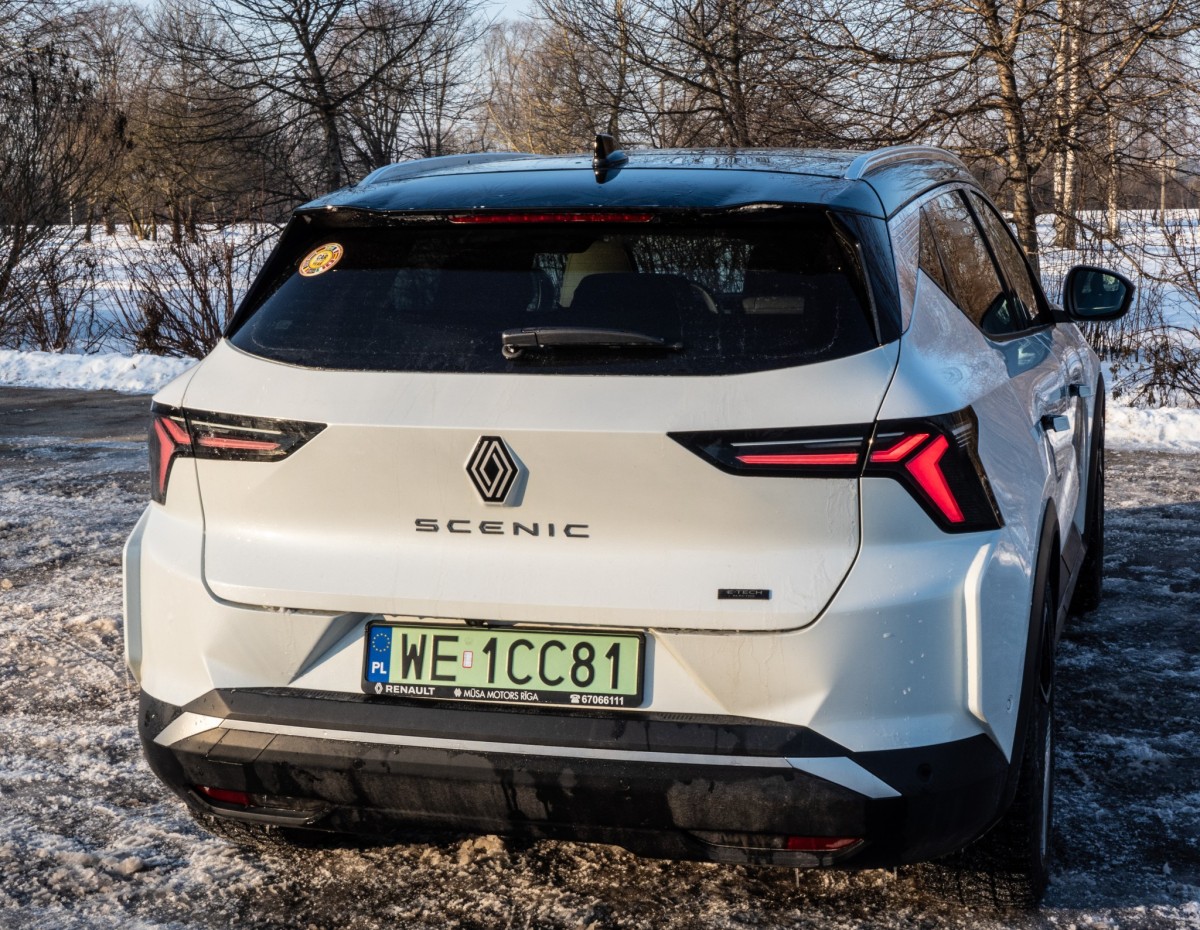 Scenic E-Tech ir izteiksmīga priekšējā reste, kurā integrēts Renault dimanta raksts, liela logotipa emblēma, kas kalpo kā elegants noformējums priekšējam radaram, kā arī stūrainu LED lukturu komplekts. Ievelkamie durvju rokturi, kas aizgūti no augstākās klases elektriskajiem automobiļiem, piešķir modernu pieskārienu un uzlabo aerodinamiku. Lai arī rokturi lielākoties iebīdās un izbīdās automātiski, ir reizes, kad no iebīdīta stāvokļa tie ir jāizķibina pašiem, kas sākotnēji prasa pierast. Aerodinamikas vārdā veidoti arī citi elementi, piemēram spoileris apkārt aizmugurējam logam un stūraini ķīļi aizmugurējā bufera sānos, kā arī riteņu diski. Atkarībā no komplektācijas, Scenic E-Tech tiek komplektēts ar 19 vai 20 collu vieglmetāla diskiem. Standartā Scenic E-Tech tiek piedāvāts sarkanā virsbūves krāsā, bet par papildus samaksu iespējams iegūt 12 citus virsbūves toņus un divtoņu kombinācijas.