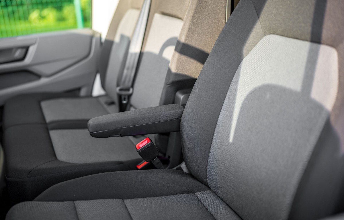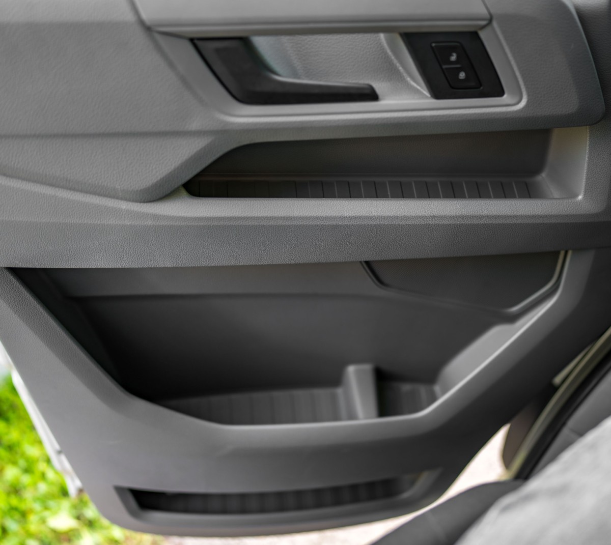 “Crafter” salonā ir daudz dažādas mantu novietnes - praktiskākas un ne tik praktiskas, taču tās ir it visur. Durvju apšuvums ir sadalīts trīs līmeņos, kur katrā no tiem ievietot lielākus un mazākus priekšmetus. Arī priekšējā panelī vietu netrūkst - ir visādas nišas, cimdu nodalījums, glāzīšu un pudeļu turētāji. Paneļa virspusē novietotajos plauktos ir iestrādātas papildus USB-C ligzdas, taču tie varēja būt ar aizveramu vāku, citādi viss novietotais atspīd vējstiklā un apgrūtina redzamību. Ir mantu glabātuves zem pasažieru sēdvietām, kā arī viena no atzveltnēm ir nolokāma, tā izveidojot darba galdiņu. Salona apdare ir veidota no cietas plastmasas, kas komercauto gadījumā ir praktiskāka un izturīgāka, bet “Crafter” gadījumā par montāžas kvalitāti nav iebildumu. Paneļi veidoti ar tekstūru, radot iespaidu, ka izmantoti augstvērtīgāki materiāli. Līdz ar jauno informācijas un izklaides sistēmu ir mainījies veids kā regulēt klimata kontroli - vai nu izmantojot izvēlnes skārienjutīgajā ekrānā, vai arī ar skārienjutīgajām virsmām zem tā. Šis risinājums ir bieži kritizēts citos “Volkswagen” modeļos, bet komercauto to lietot varētu būt vēl grūtāk, it īpaši, ja vadītājs mēdz izmantot cimdus.