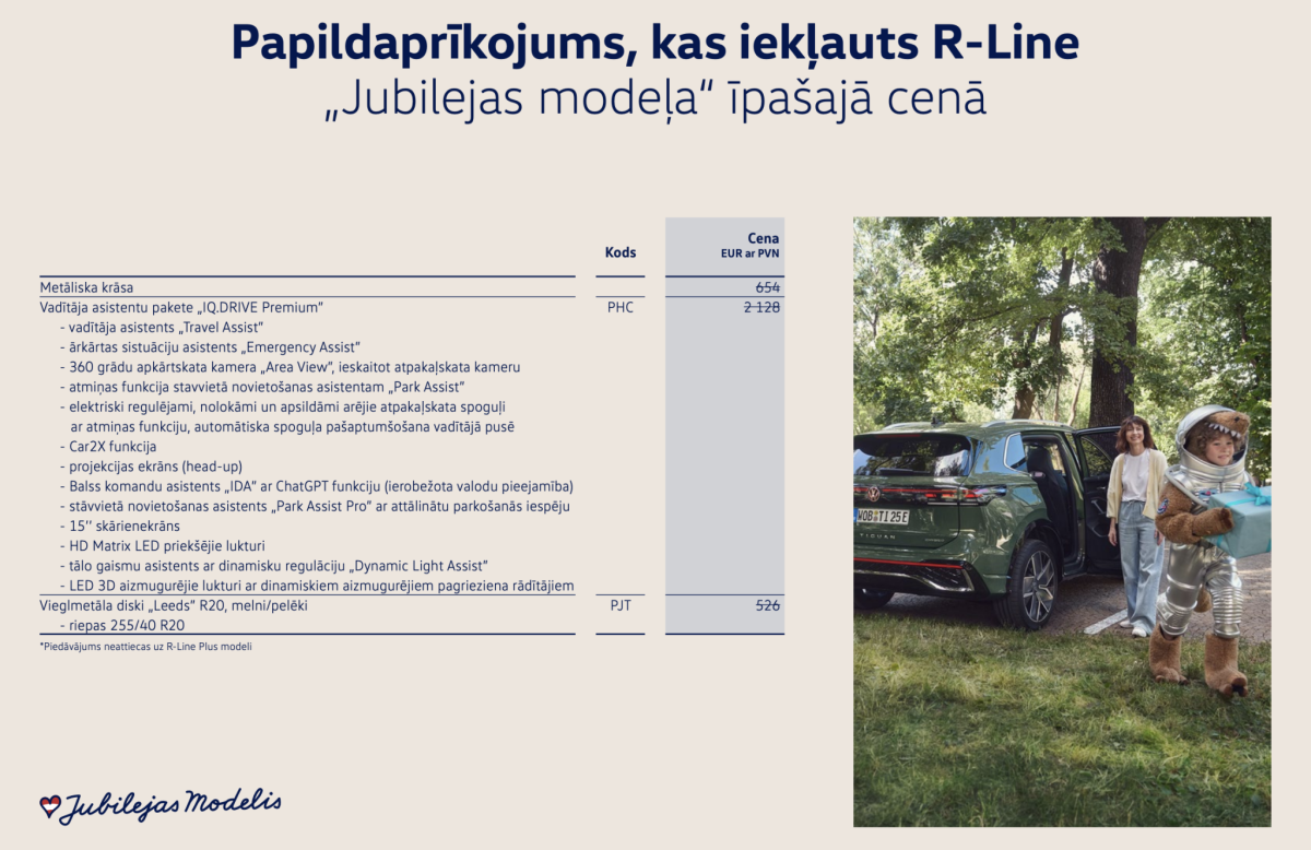 Arī “R-Line” jubilejas modeļa cenā iekļautas gan vairākas iepriekš nosauktās ekstras, gan arī projekcijas ekrāns vējstiklā, LED matricu gaismas, stāvvietas asistents ar attālinātu parkošanās iespēju, lielāks informācijas un izklaides sistēmas ekrāns 15 collu izmērā, “Keyless” bezatslēgas piekļuve un 20 collu vieglmetāla diski. Šādi nokomplektēti “Tiguan” maksā no 43 tūkstošiem līdz nepilniem 50 tūkstošiem eiro.
