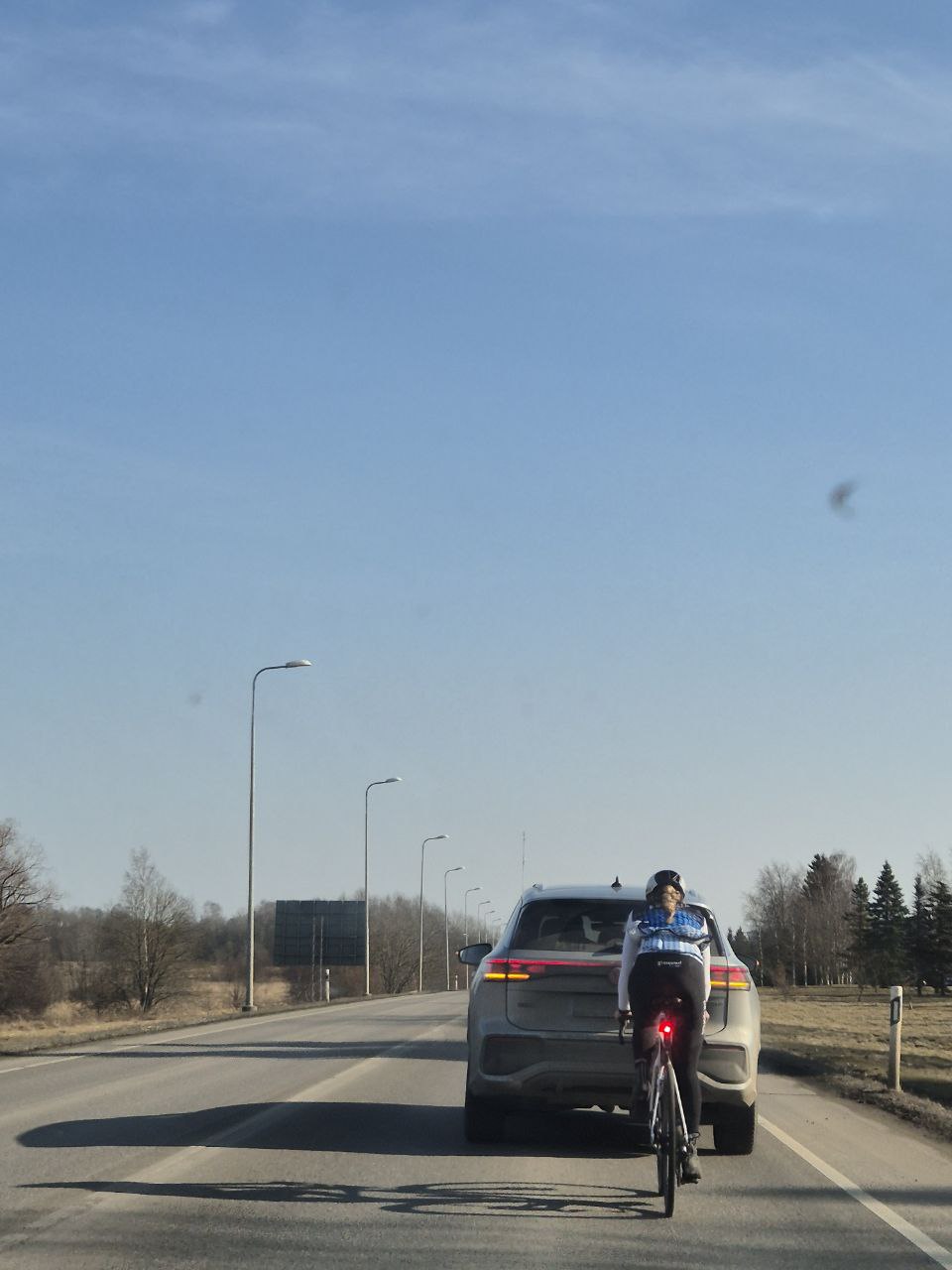 Šāds skats tika novērots vienā no Igaunijas pilsētām - velobraucēja centās uzturēt pilsētā atļautos 50 km/h, taču tas īsti neizdevās un aiz viņas izveidojās vairāku automašīnu rinda. Šķiet, ka autovadītāji nebija gatavi ilgstoši braukt aiz sportistes ar ātrumu 45 km/h, tādēļ pie katras izdevības steidzās tandēmu apdzīt, tostarp diezgan agresīvā veidā un saceļot putekļu vērpetes. Ārpus pilsētas tika manīti arī citi velosporta aktīvisti - bez pavadošā transporta, un likās, ka viņus autovadītāji uztvēra saprotošāk, kaut vai tā iemesla dēļ, ka satiksmi neviens nebremzēja, bet apdzīt vai apsteigt tos bija vieglāk.